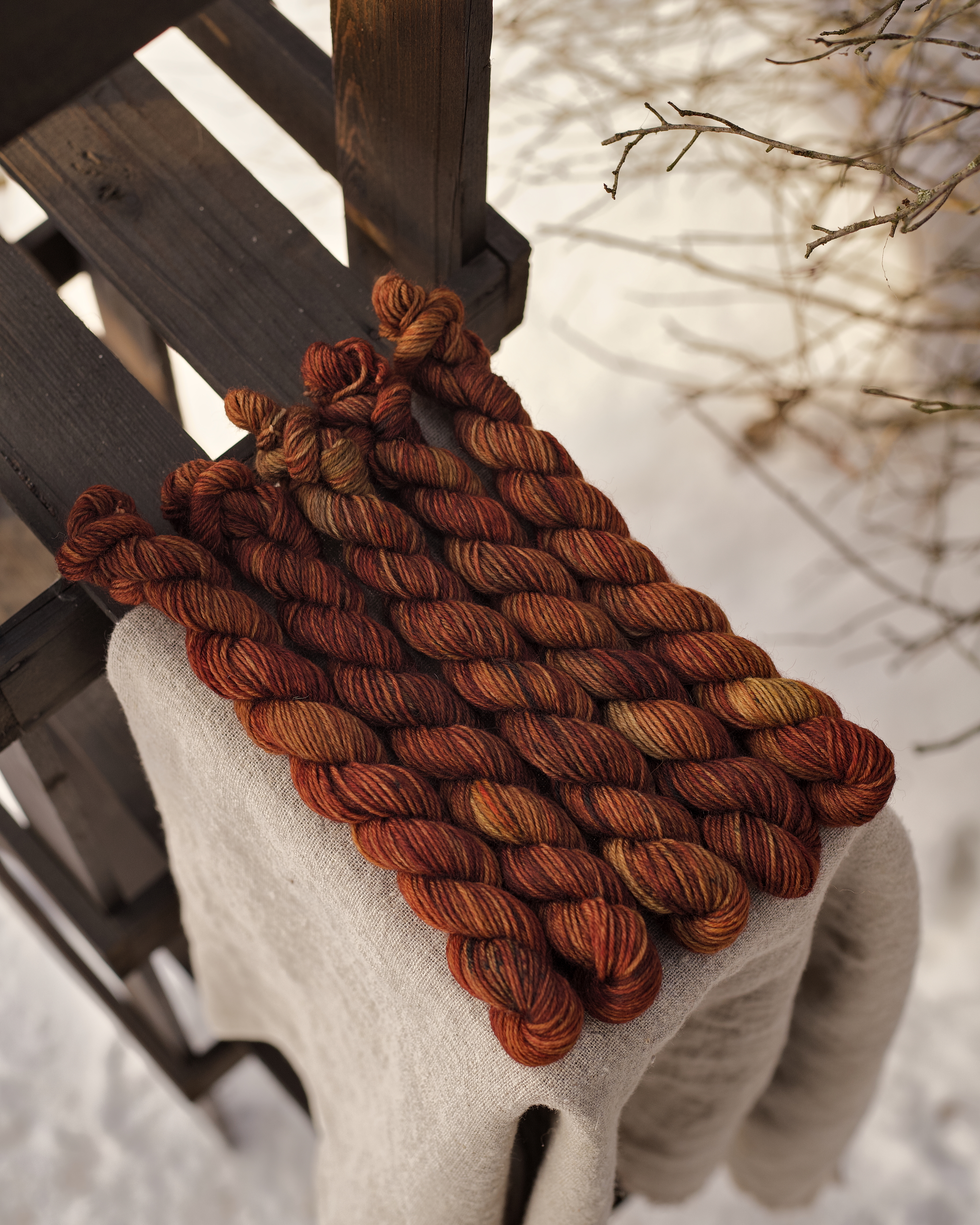 Мини пасмы из классической носочной пряжи с добавлением полиамида. Основа - немецкая. Несмотря на то,что это шерсть, тактильно полотно приятное, а благодаря полиамиду в составе изделия прлучаются износостойкие. Отлично подходит для вязания носков, перчаток, шалей.