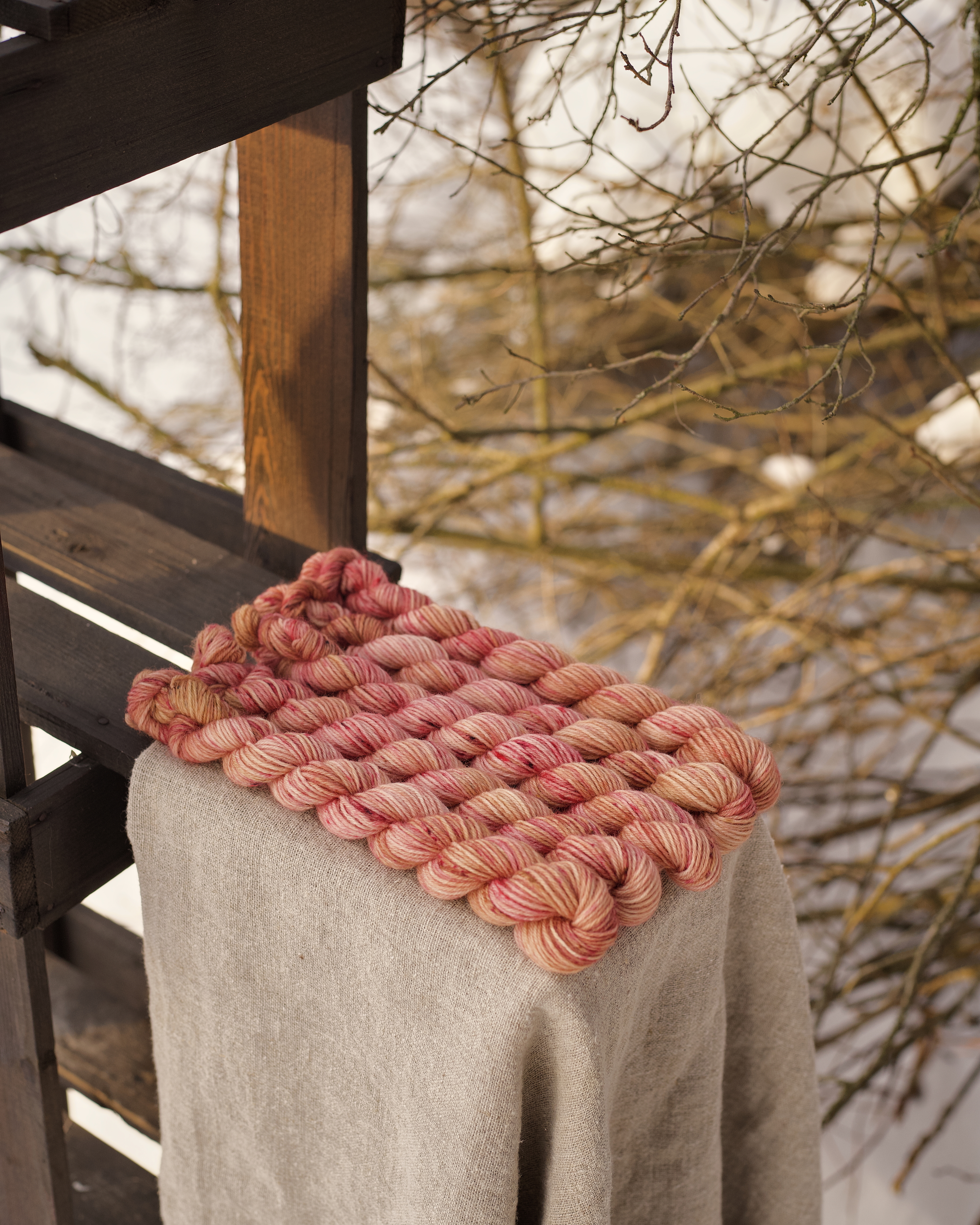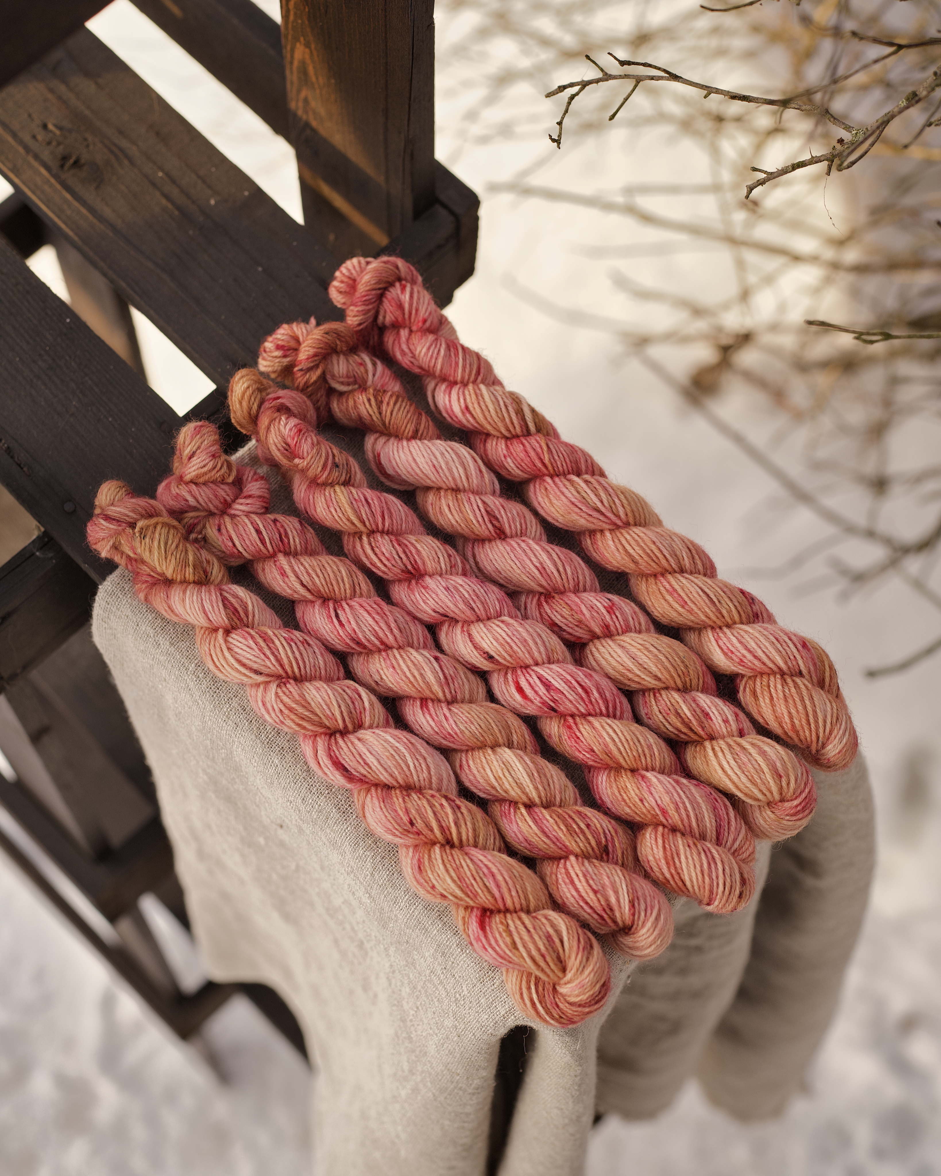 Мини пасмы из классической носочной пряжи с добавлением полиамида. Основа - немецкая. Несмотря на то,что это шерсть, тактильно полотно приятное, а благодаря полиамиду в составе изделия прлучаются износостойкие. Отлично подходит для вязания носков, перчаток, шалей.