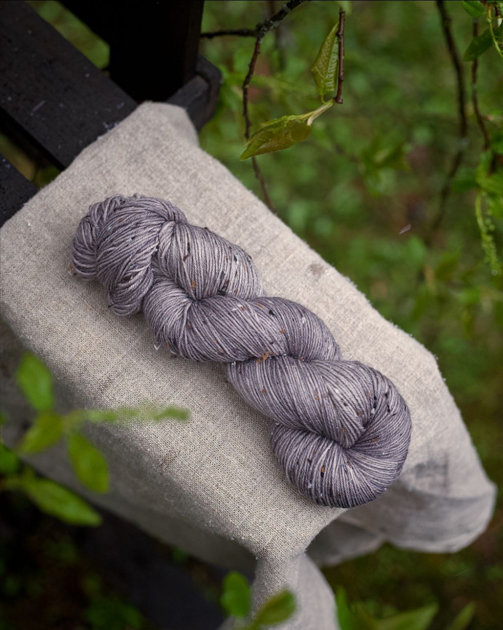 Пряжа ручного окрашивания на основе мериноса с нейлоном и ворсинками твида. Это носочная пряжа - из нее можно связать носки или другие чулочные изделия. Однако подойдет также для вязания шалей, перчаток, свитеров, шапок и бактусов. Одной пасмы хватит на пару взрослых носков или две пары перчаток. На плечевое изделие нужно от трех пасм, на шаль - две пасмы.